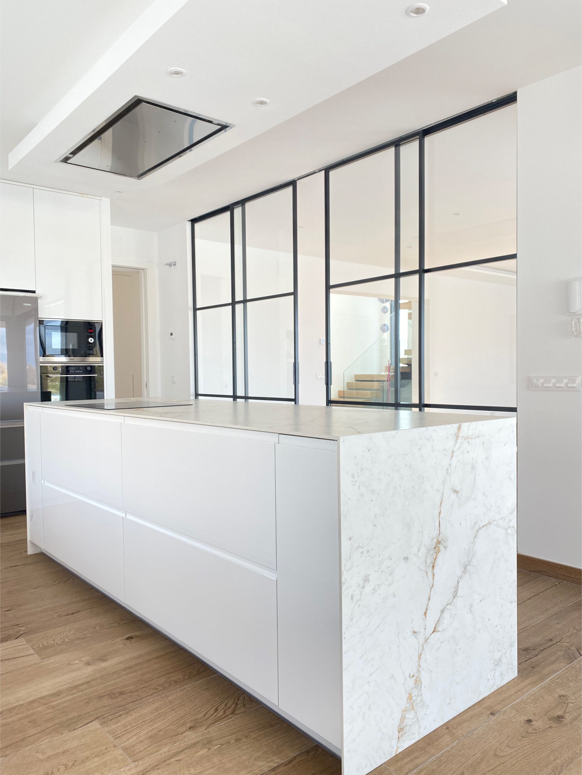The kitchen, which features a large neolith island, was designed in light tones preserving the minimalist style of the home. In line with the façade of the house, we integrated a vertical wall made of masonry stone, thus generating warmth in the room.